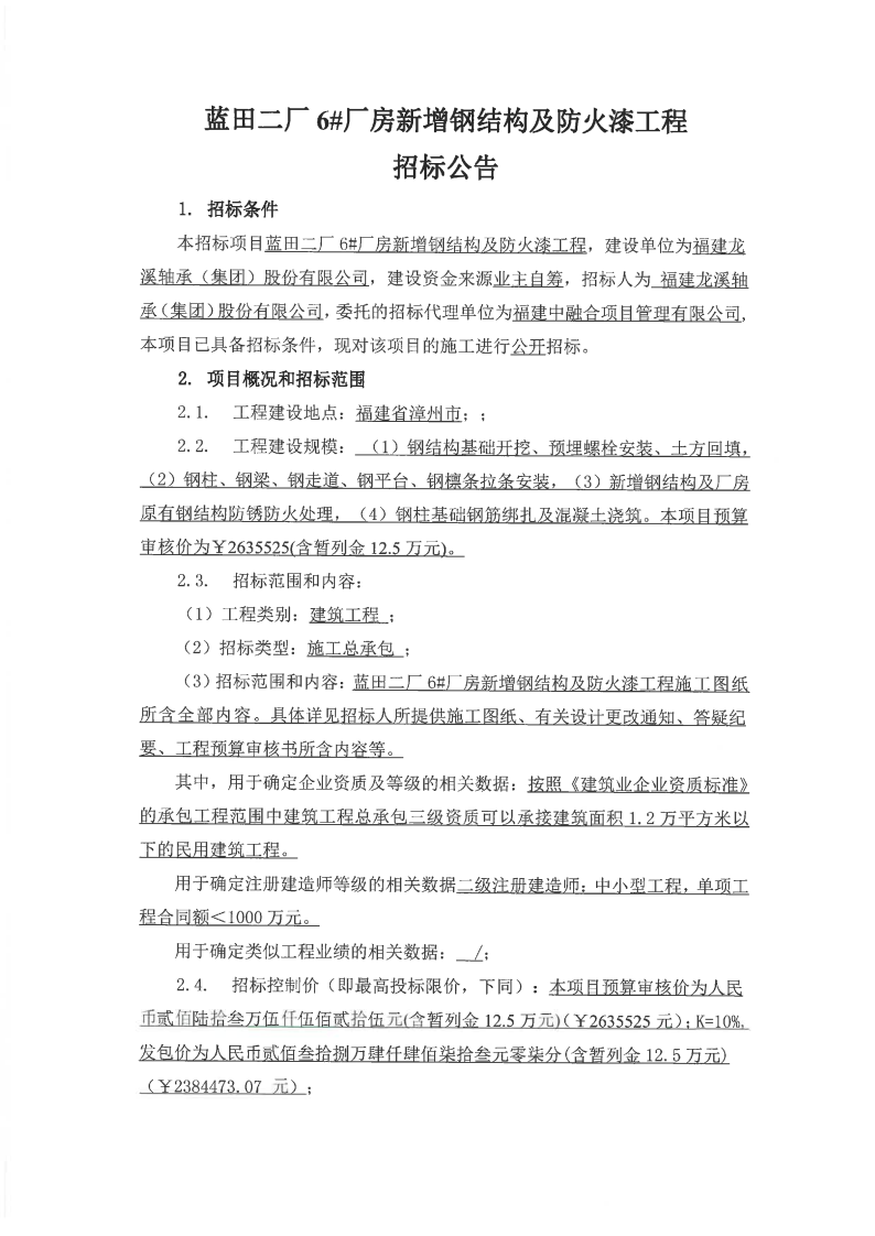龍軸集團藍田二廠6#廠房新增鋼結構及防火漆工程招標公告公示
