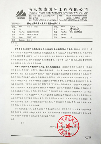 近日,一封表?yè)P(yáng)信寄到了公司國(guó)內(nèi)市場(chǎng)部。原來,為感謝公司技術(shù)員陳朱池、林榮源提供的細(xì)致貼心的技術(shù)服務(wù),南京凱盛國(guó)際工程有限公司(下稱南京凱盛)特意寄來了這封表?yè)P(yáng)信。
