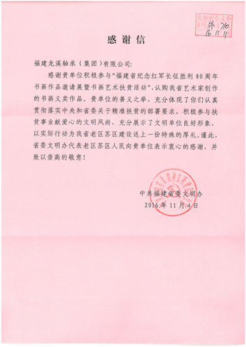近日,一封感謝信寄到了公司。原來,為感謝公司積極參與“福建省紀(jì)念紅軍長(zhǎng)征勝利80周年書畫作品邀請(qǐng)展暨書畫藝術(shù)扶貧活動(dòng)”,認(rèn)購(gòu)我省藝術(shù)家書畫義賣作品,為我省老區(qū)蘇區(qū)建設(shè)貢獻(xiàn)一份力量,省委文明辦特意寄來了這封感謝信。