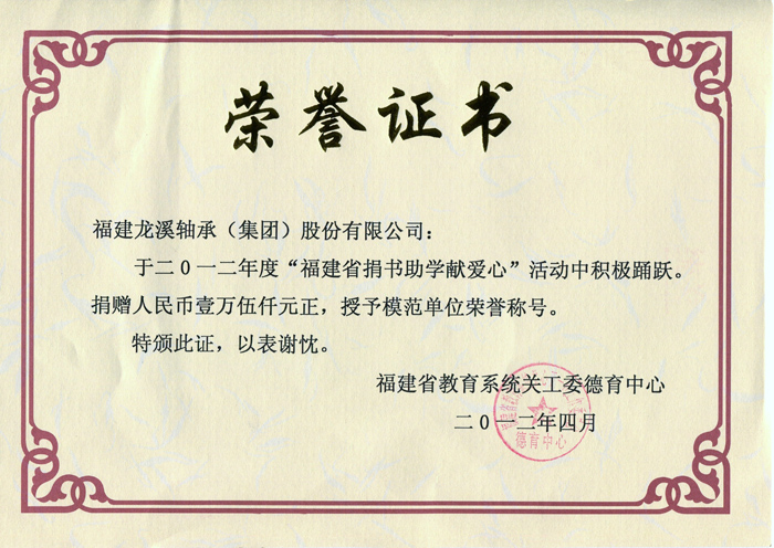 二O一二年度福建省捐書助學(xué)獻愛心活動模范單位證書