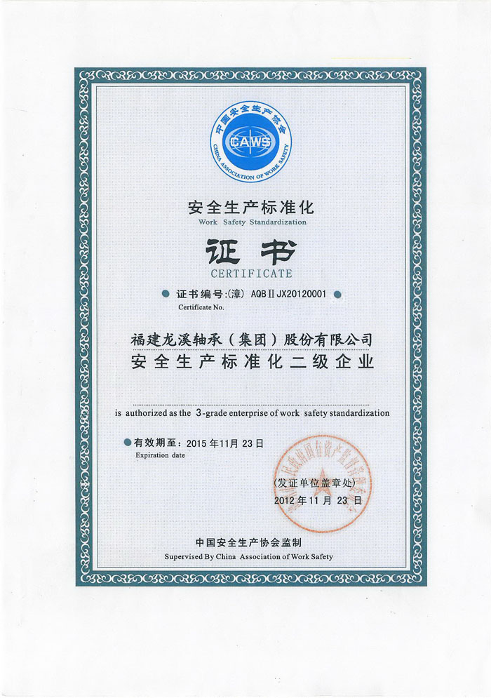 安全生產標準化二級企業證書